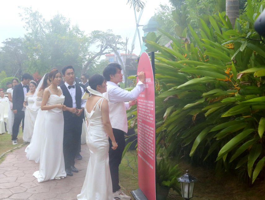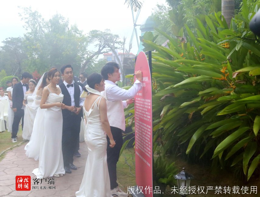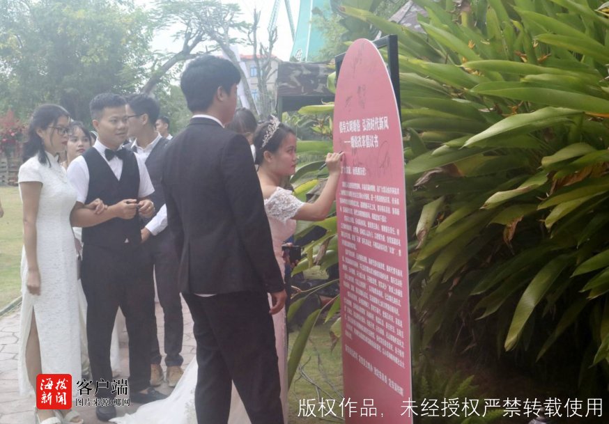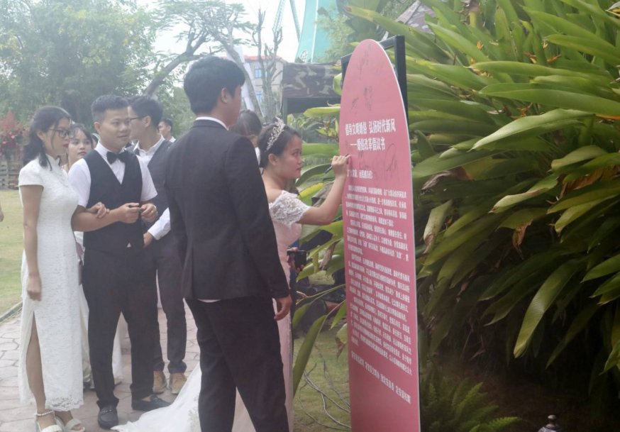 商报全媒体讯(椰网/海拔新闻记者 徐明锋 摄影报道)8月22日正值“七夕”传统佳节,定安移风易俗宣传活动暨香草田园集体婚礼活动在香草田园共享农庄举行。15对新人在现场嘉宾的祝福和观礼亲友、到场观众的集体见证下,携手走进婚姻殿堂,并集体签署“倡导文明婚俗 弘扬时代新风——婚俗改革倡议书”。