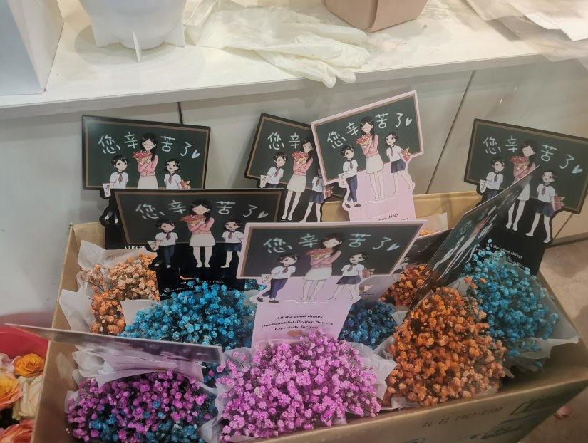 符女士笑着告诉记者,二人并不是老师,而是孩子家长,要在中午前送到学校。“表达对老师的感谢之情,选择送康乃馨给老师,代表老师像长辈一样关怀学生。”