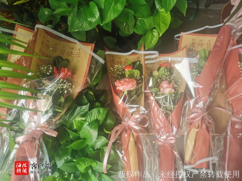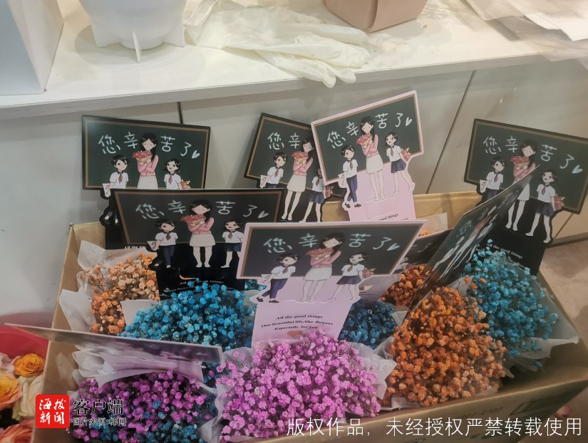 “万里春风抚摸万物生机,犹如教师育人,恩情难忘。”在西沙路的一家鲜花店,店员向记者介绍,今年教师节店内主打“清风颂”主题鲜花礼物。“有向日葵、康乃馨、满天星,顾客到店可以根据自己的喜好DIY印有‘老师您辛苦了’的手提礼盒。”